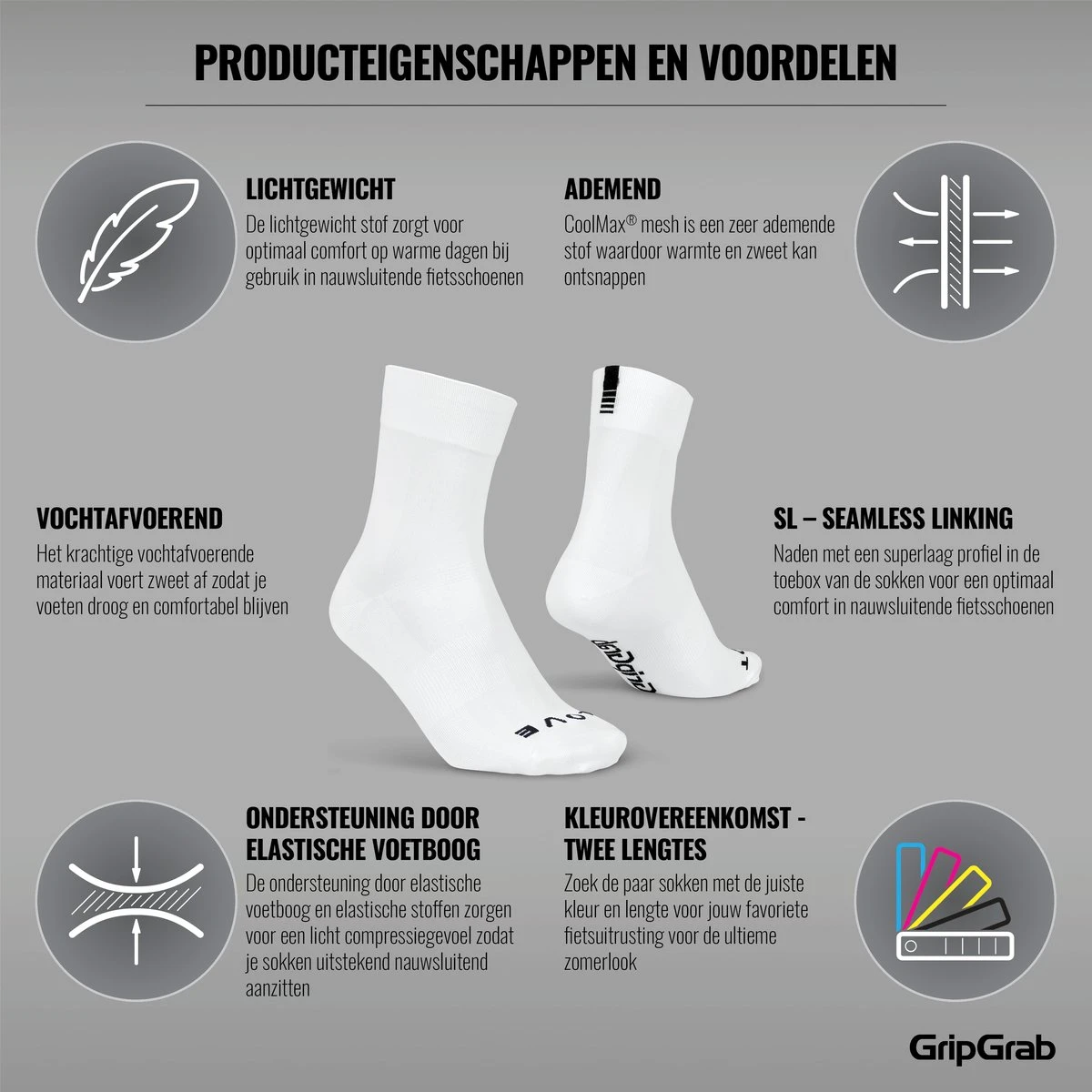 Minimale branding, maximale stijl – Met het simpele, eenvoudige design van deze fietssokken ben je tijdloos stijlvol gekleed; kort, ca. 9 cm hoog, lang ca. 15 cm hoog. Geen verschuiven – Ondersteunende stretch-inlegstukken bij de middelvoet zorgen voor een nauwe, aangename pasvorm; de sokken ondersteunen goed en sluiten nauw aan, zodat ze niet verschuiven. Niet oververhitten – Deze coole en kleurrijke fietssokken zijn gemaakt van licht en vochtregulerend Coolmax-materiaal met mesh-zones, zodat je voeten droog en comfortabel blijven. Foot Love – Liefdevolle details onderstrepen onze passie voor high performance-fietssokken en de fietssport; een korte en een hoge versie, elk in 10 kleuren, vervolledigen je outfit helemaal. Gemakkelijk te combineren – Deze bikesokken zijn een onderdeel van de kleurrijke GripGrab Mix&Match-serie; ze kunnen gemakkelijk worden gecombineerd met andere producten uit de Mix&Match-serie.