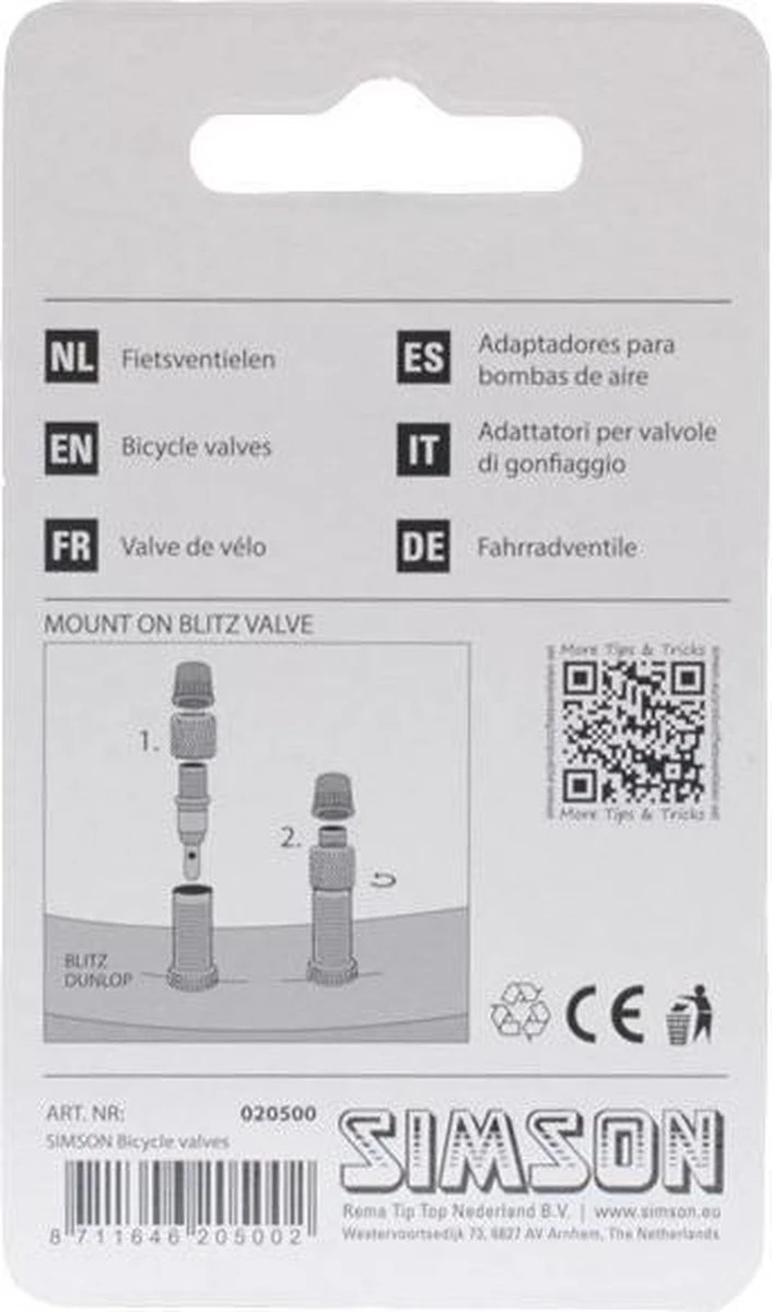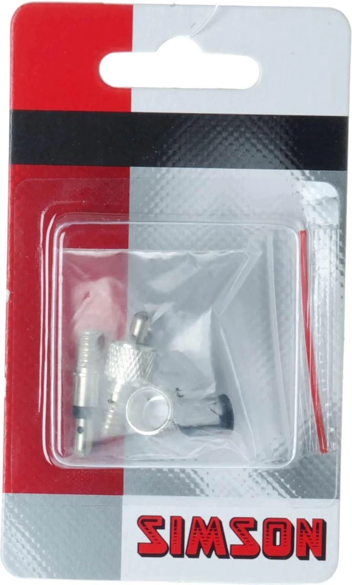 De Simson Ventiel set is ter vervanging van het bestaande lekkende Dunlop ventielen, Blitz ventielen en ‘Hollandse ventielen’. Advies: plaats altijd het ventieldopje op het ventiel, dit ter voorkoming van het lekken door stofdeeltjes. Doordat de Simson ventielen compleet worden geleverd, hoef je geen onderdelen over te zetten. En kun je eenvoudigweg het kapotte ventiel vervangen voor een nieuwe.