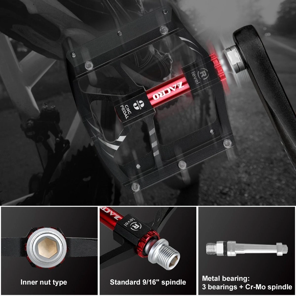 Mooi uiterlijk ontwerp en goede vervormingsbestendige eigenschap, met 3 lagers, Zacro-fietspedaal is sterk, duurzaam. Fietspedaal weegt slechts 352 g (12,4 oz) / paar. Antislip nageloppervlak, sterke grepen, niet langer slippen, om de veiligheid van de rijder te garanderen. Groot platformpedaal is geschikt voor langdurig rijcomfort en trapefficiëntie.